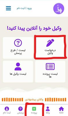 با کلیک روی دکمه «درخواست وکیل» در صفحه اول یا دکمه «پرونده» در منو پایین شما به فرم «ثبت پرونده» منتقل می شوید.