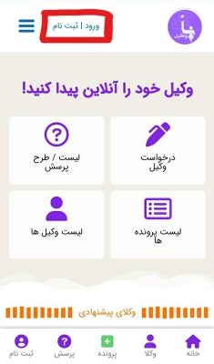 این صفحه اول هست که در آن میتوانید از تمام امکانات وکیل ناجی استفاده کنید ولی این امکانات به صورت کامل کار نمی کنند مگر آنکه ثبت نام کنید. پس قدم اول ثبت نام هست. شما میتوانید با دکمه «ورود و ثبت نام» که در بالای صفحه قرار دارد، رایگان ثبت نام کنید. برای دفعات بعد نیازی به ثبت نام نیست و میتوانید از طریق همان دکمه با شماره تلفن و رمزتان «وارد» شوید