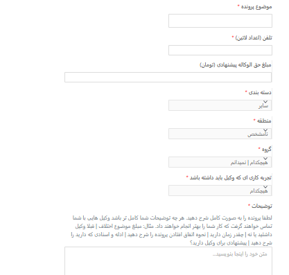 در صفحه ارسال پرونده میتوانید یک توضیح کلی از پرونده تان ارسال کنید تا وکیل ها متوجه بشوند شما مشکلتان چیست تا برای حل آن با شما تماس بگیرند. اطلاعات فرم را پر کنید و سعی کنید توضیحات خوب و مناسب بدهید تا وکلای تایید شده با شما تماس بگیرند